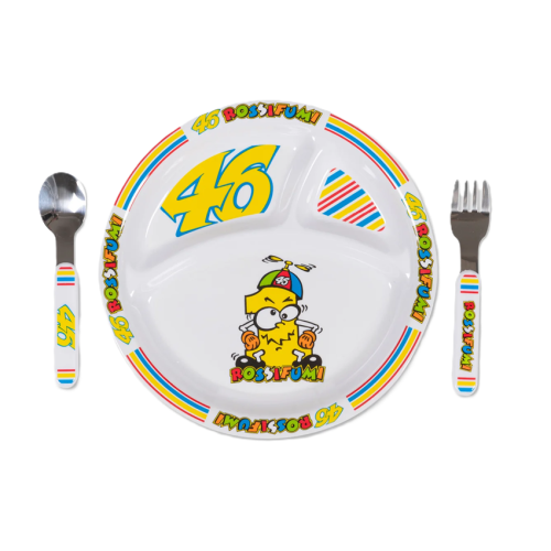Zestaw obiadowy z kolekcji VR46 Heritage Valentino Rossiego, linii poświęconej markom i historycznym momentom w karierze Valentino. Zestaw składa się z 3-komorowego talerza, widelca i łyżki, a jego grafika przedstawia historyczne 46, Rossifumi oraz karykaturę cyfry 1, symbolizującej pierwsze mistrzostwo świata Valentino.